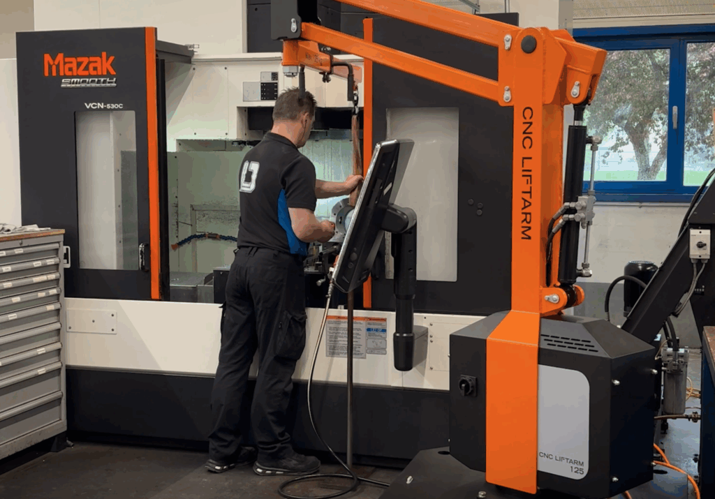 De CNC LiftArm maakt het mogelijk om werkstukken tot 125 kilogram gecontroleerd te tillen en te positioneren. Het systeem werkt hydraulisch en heeft een flexibele, scharnierbare arm, waardoor het ook vanaf de zijkant van een machine inzetbaar is. Dat voorkomt dat operators in een ongemakkelijke houding moeten werken of de toegang tot de machine belemmeren.