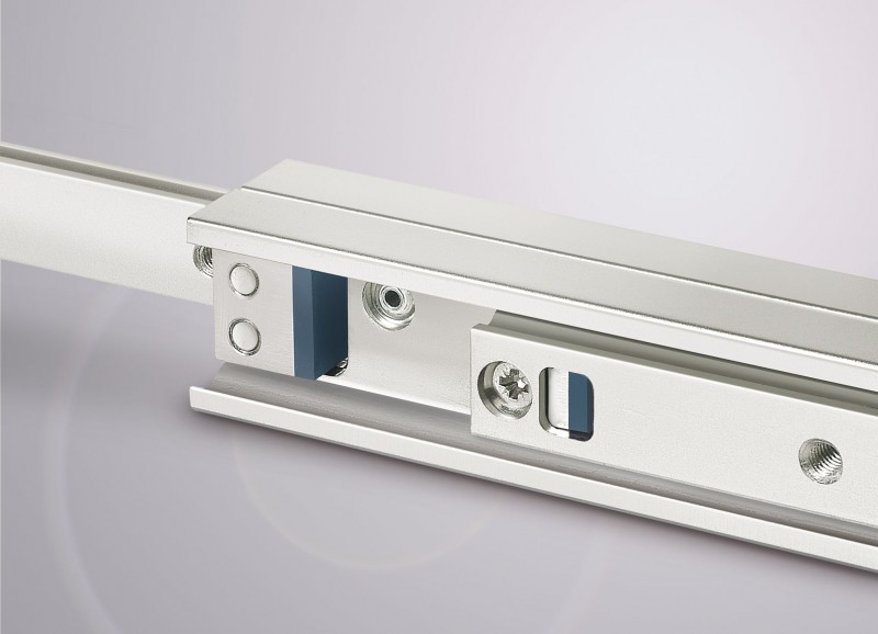 De volledig uitschuifbare DS-serie bestaat uit twee rails met een S-vormig tussenelement. De nieuwe DSS 43 Syn is een uitbreiding van de reeds bestaande DSS 43-geleiding van Rollon met een tandwielaandrijvingsysteem. Dankzij het ingebouwde tandwiel bewegen de schuifdelen van de telescoop exact synchroon tijdens het in- en uitschuiven van de rails. De gesynchroniseerde DSS 43 Syn is ideaal voor bijvoorbeeld automatisch aangedreven lades. Doordat de telescopische geleidingen exact synchroon in- en uitschuiven ten opzichte van elkaar, beweegt de lade zeer vloeiend. Daarnaast heeft Rollon de DS-familie uitgerust met een verstevigde eindaanslag, voorzien van kunststof dempingsmateriaal. Dankzij de aanslag komen de beweegbare delen in de rails gedempt tot stilstand. De geleidingen zijn daardoor niet alleen stiller in gebruik, maar ook beter beschermd tegen harde schokken. Ook de volledig uitschuifbare DE-serie van Rollon is vanaf nu voorzien van deze stille eindaanslag.
