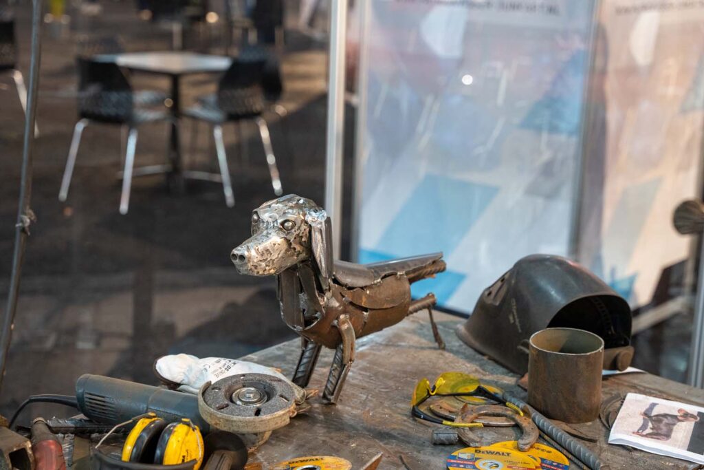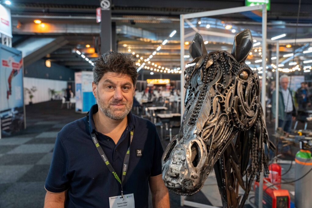 Hij was een vreemde eend in de bijt op de Metavak vakbeurs in Gorinchem. Waar talloze bedrijven hun metaalmachines onder de aandacht brachten van ondernemers in de metaalindustrie, had Patrick Vissers (44) een zelf gelaste hond uitgestald op zijn stand.