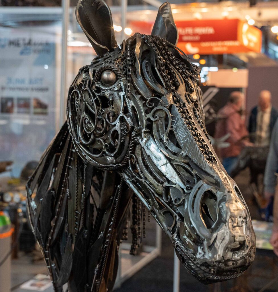 Op de stand in Gorinchem prijkte ook een paardenhoofd dat uit diverse metalen onderdelen was samengesteld. Hij gebruikt stangen, plaatijzer, betonijzer, steeksleutels, nijptangen en scharen. Dit afgedankte materiaal komt vooral van een recyclebedrijf. ‘De hoefijzers komen van een hoefsmid en bij een motor- en fietsenzaak haal ik oude kettingen, remschijven en tandwielen’, aldus de kunstenaar.