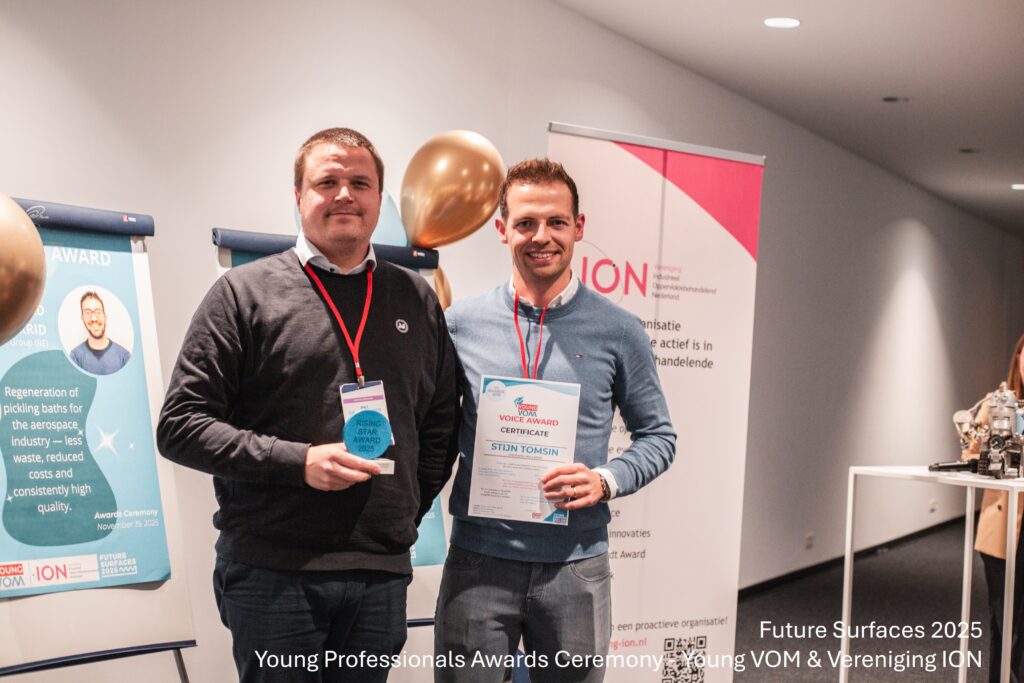 Tijdens Future Surfaces zijn op woensdag 19 november de Young Professionals Awards 2025 uitgereikt. Vereniging ION uit Nederland en Young VOM uit België bekronen daarmee jonge vakmensen die met vernieuwende projecten en sterk engagement bijdragen aan de ontwikkeling van de oppervlaktebehandelingssector. De prijzen benadrukken de gezamenlijke inzet van beide landen voor innovatie en duurzame oplossingen.
