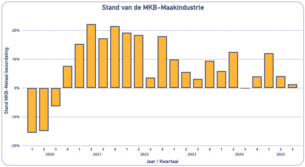 De Koninklijke Metaalunie Economische Barometer over het derde kwartaal van 2025 laat zien dat de afkoeling van de mkb-maakindustrie verder doorzet. De binnenlandse orderpositie daalt en ook de exportverwachting is negatief (-8%). Tegelijkertijd stijgen de verkoopprijzen met vijftien procent, maar het bedrijfsresultaat staat onder druk en de investeringsverwachting is negatief.