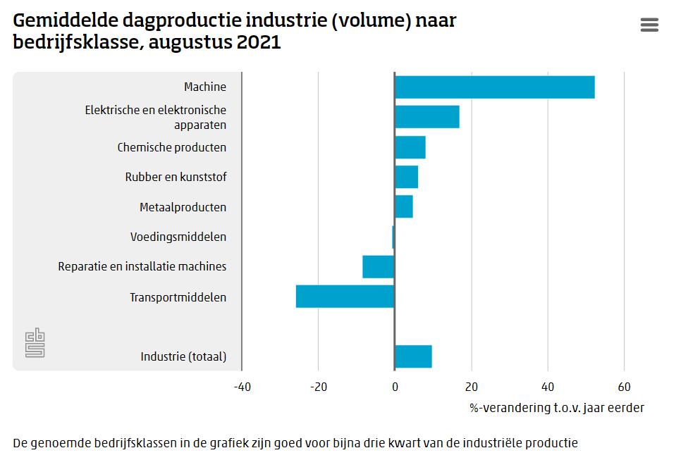 De gemiddelde dagproductie van de Nederlandse industrie was in augustus 9,8 procent hoger dan in augustus 2020, maakt het Centraal Bureau voor de Statistiek bekend. Een maand eerder kwam de groei uit op 13,7 procent. Ten opzichte van juli 2019 bedroeg de groei ongeveer zes procent.